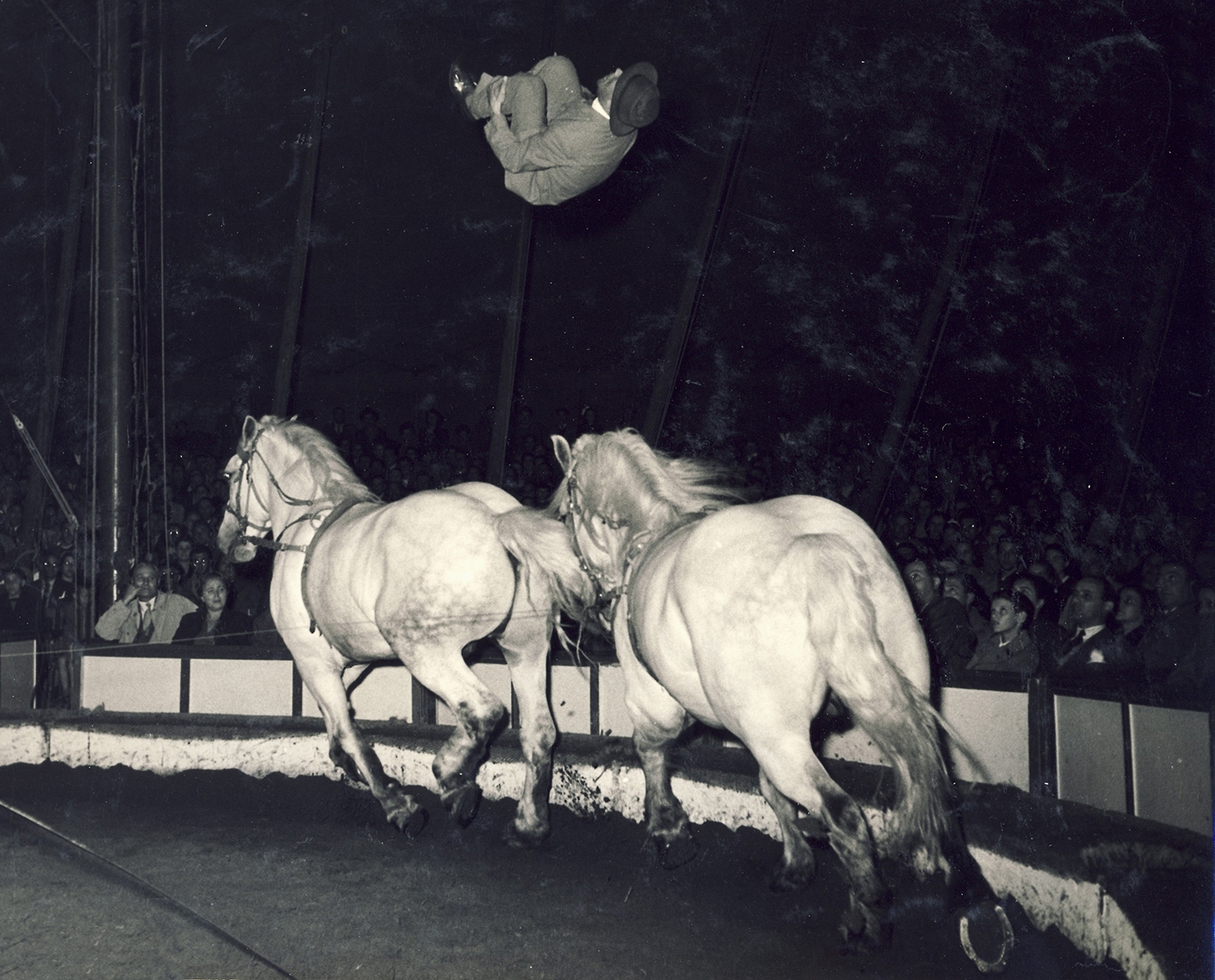 Epochenbild: Enrico Caroli beim einzigartigen Rückwärtssalto von Pferd zu Pferd.