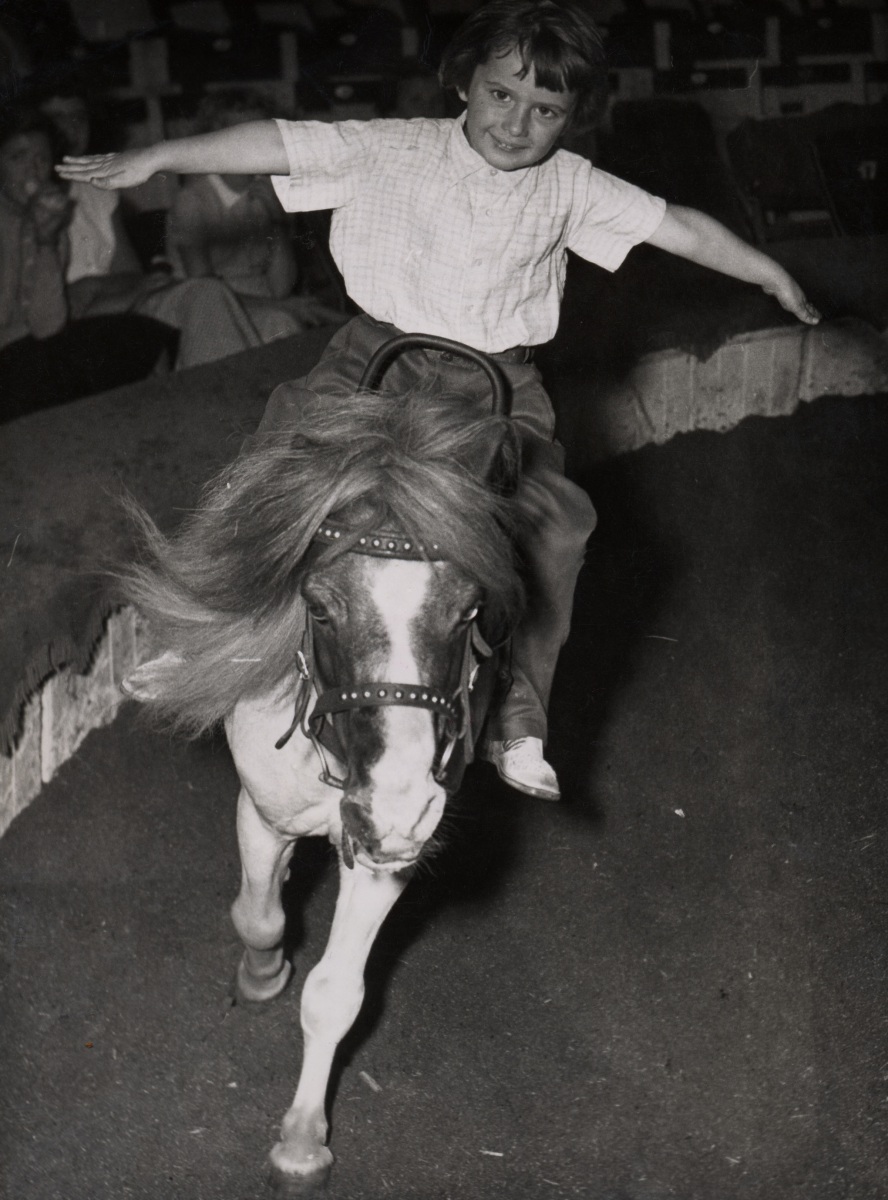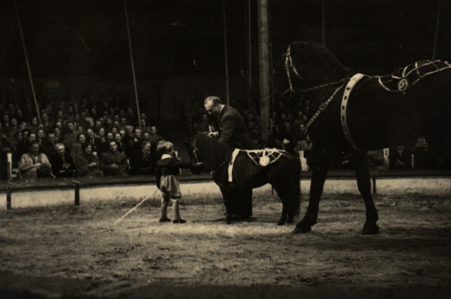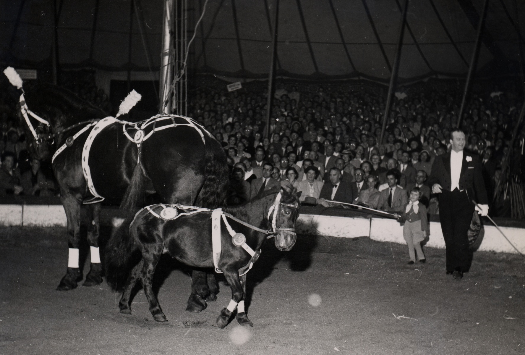 Er zeigt ein Gross (holländischer Friese «Harm») und Klein (Shetland-Pony «Eberhard») und reitet auf dem Shetland-Pony «Brandy» inklusive gesessenem Steiger unter Anleitung seines Vaters Fredy Knie sen.