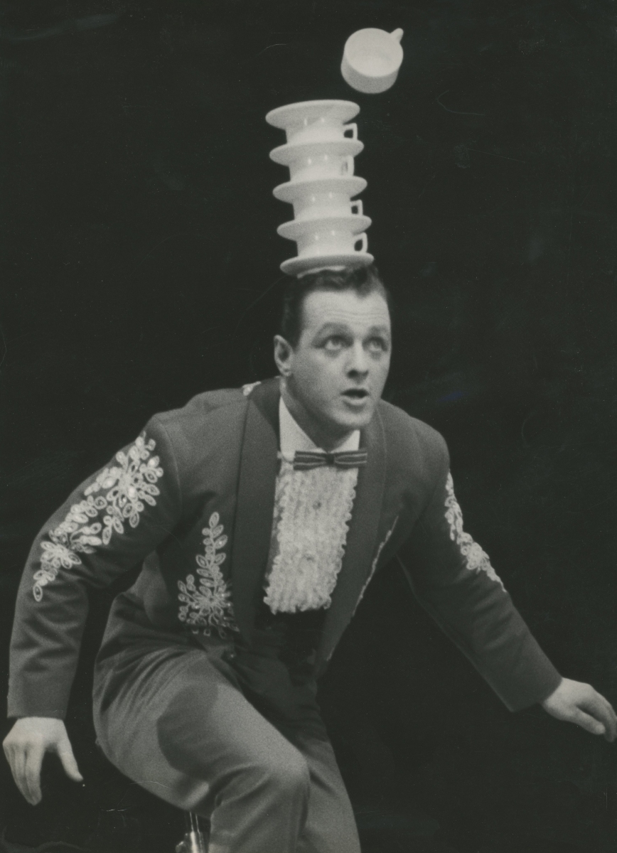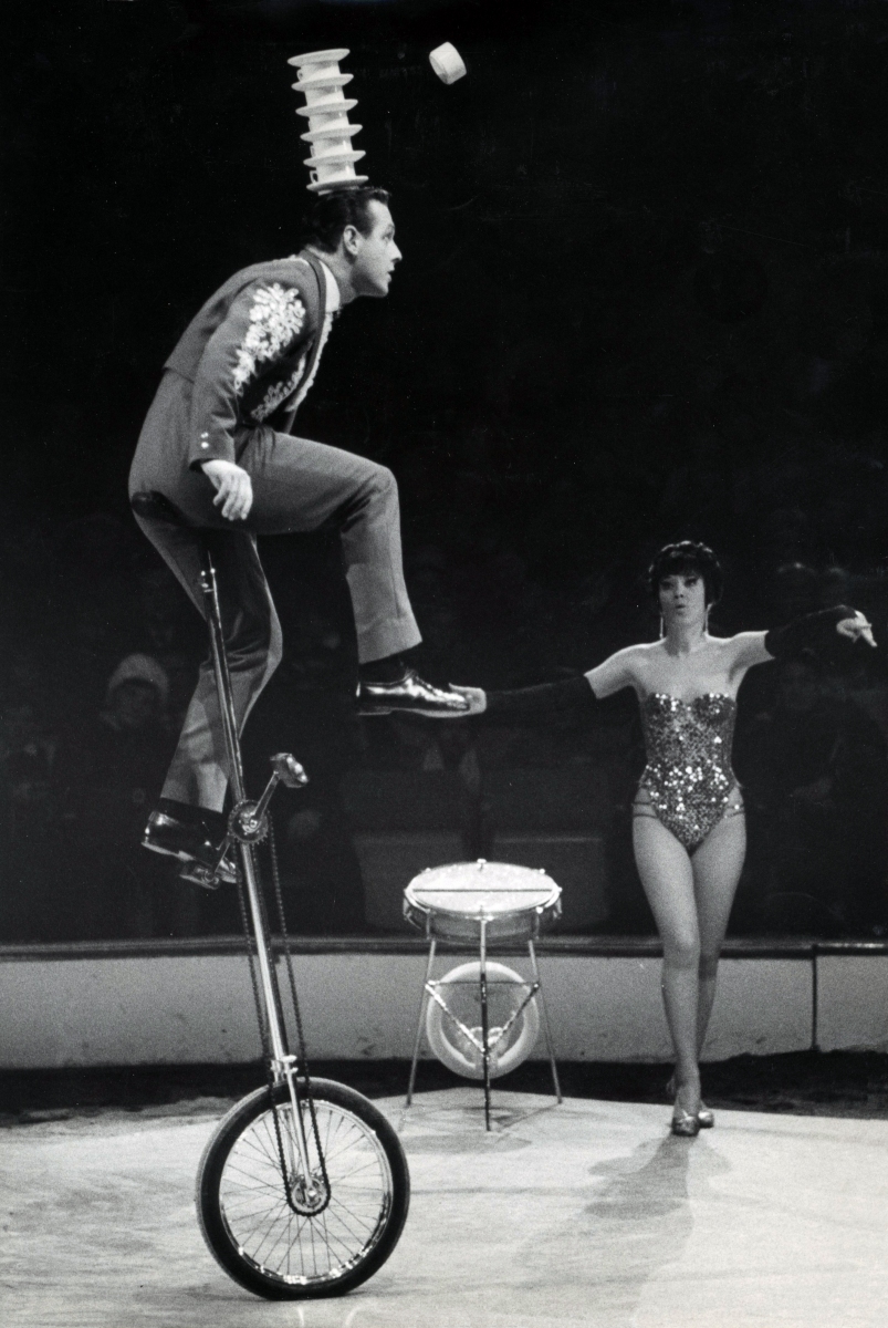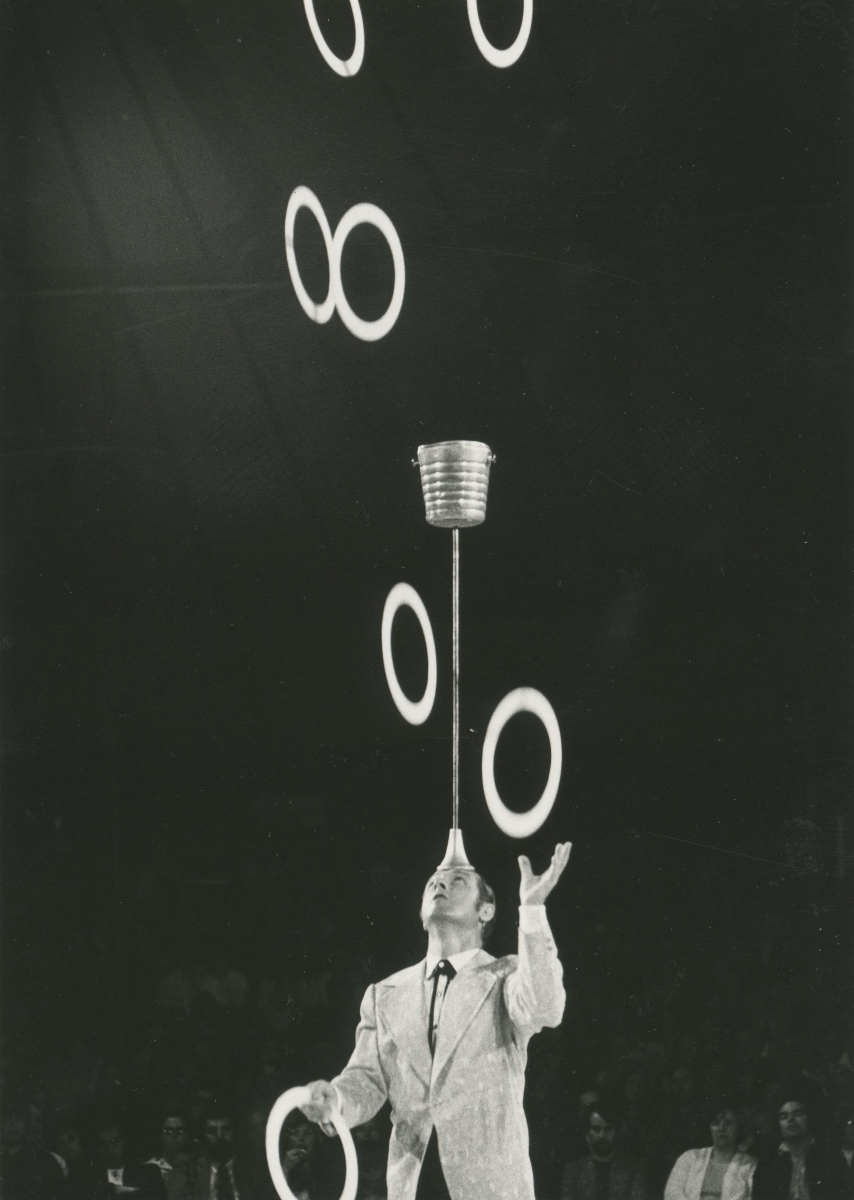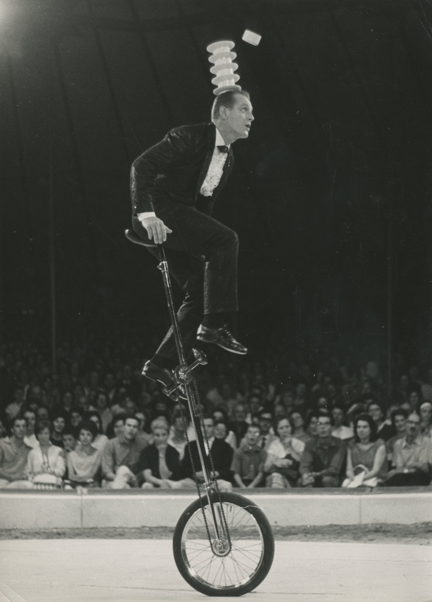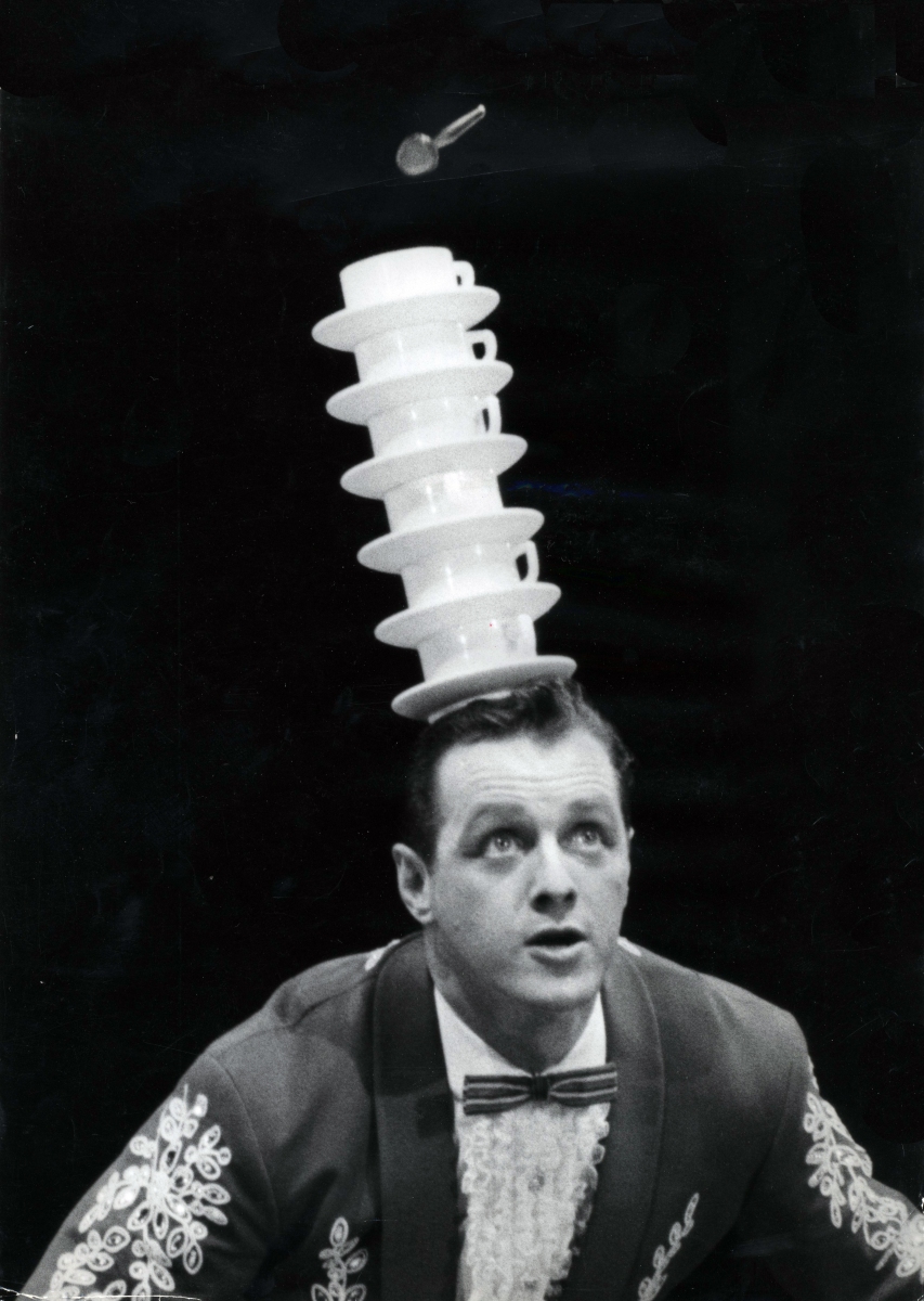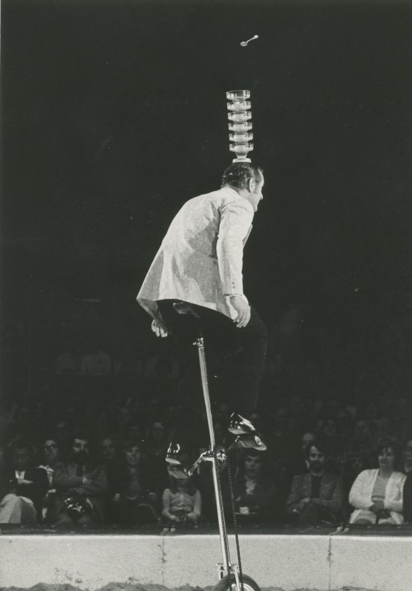 7 Bälle auf Trommel, Löffeltrick, Reifen, Keulen, Tassenjonglage auf Einrad;