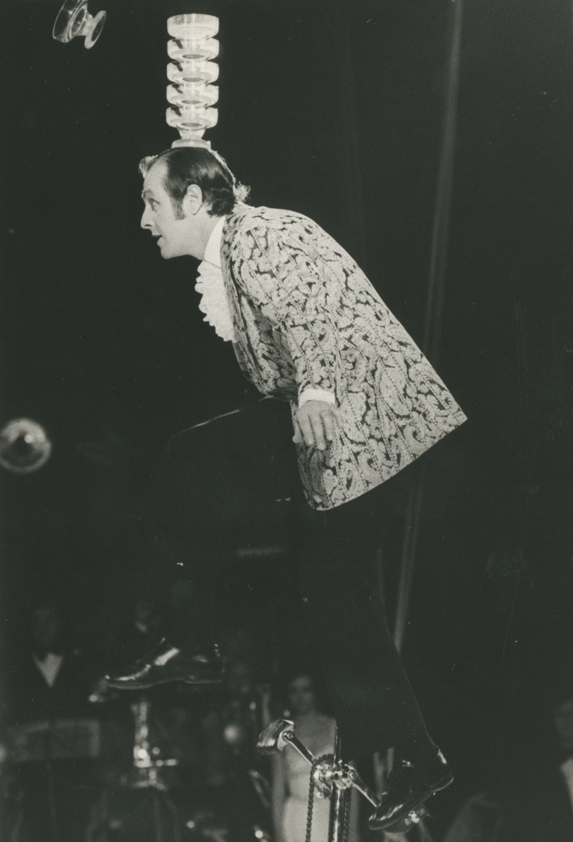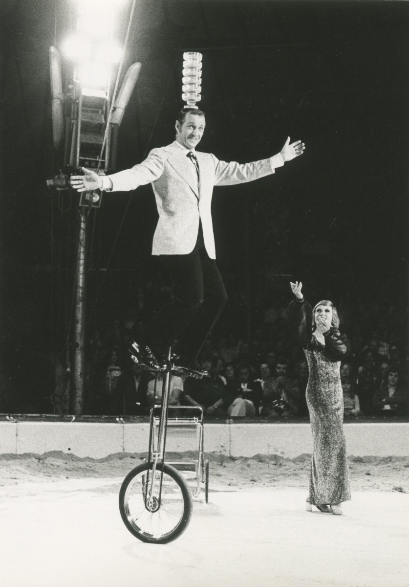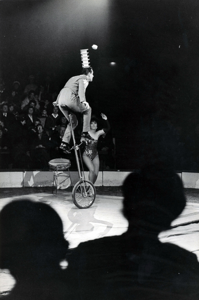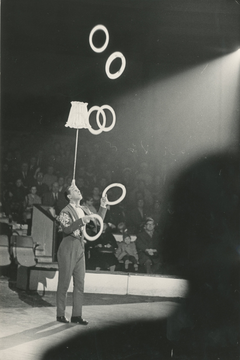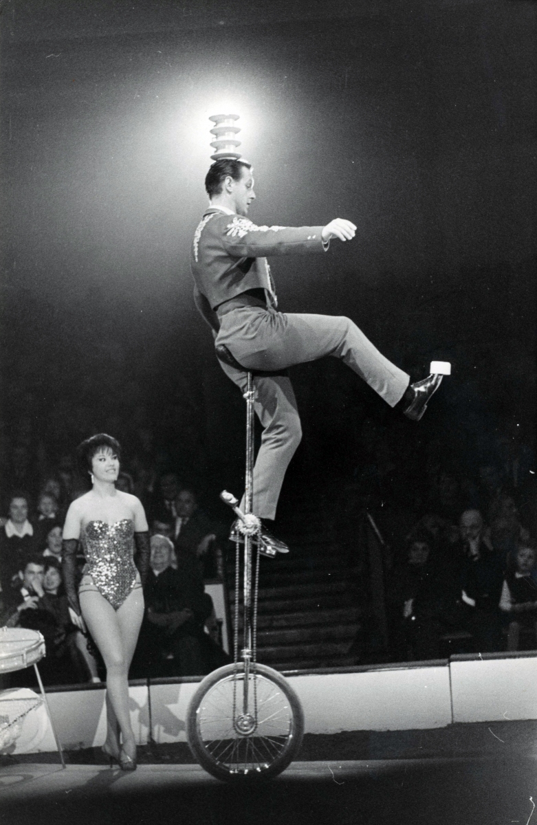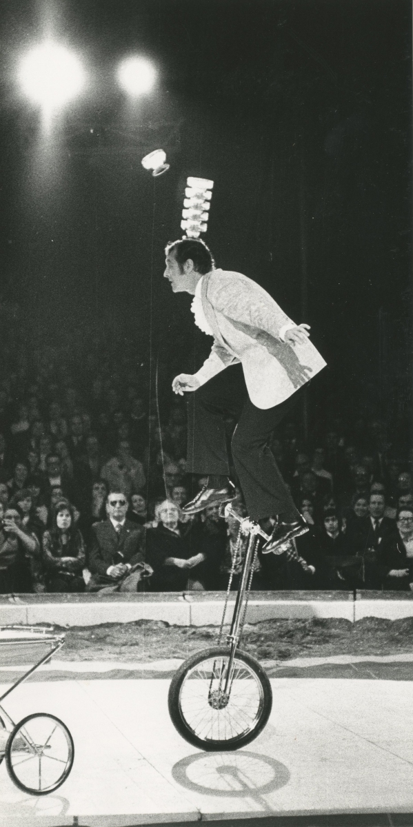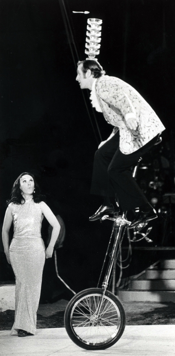 7 Bälle auf Trommel, Löffeltrick, Reifen, Keulen, Tassenjonglage auf Einrad;
