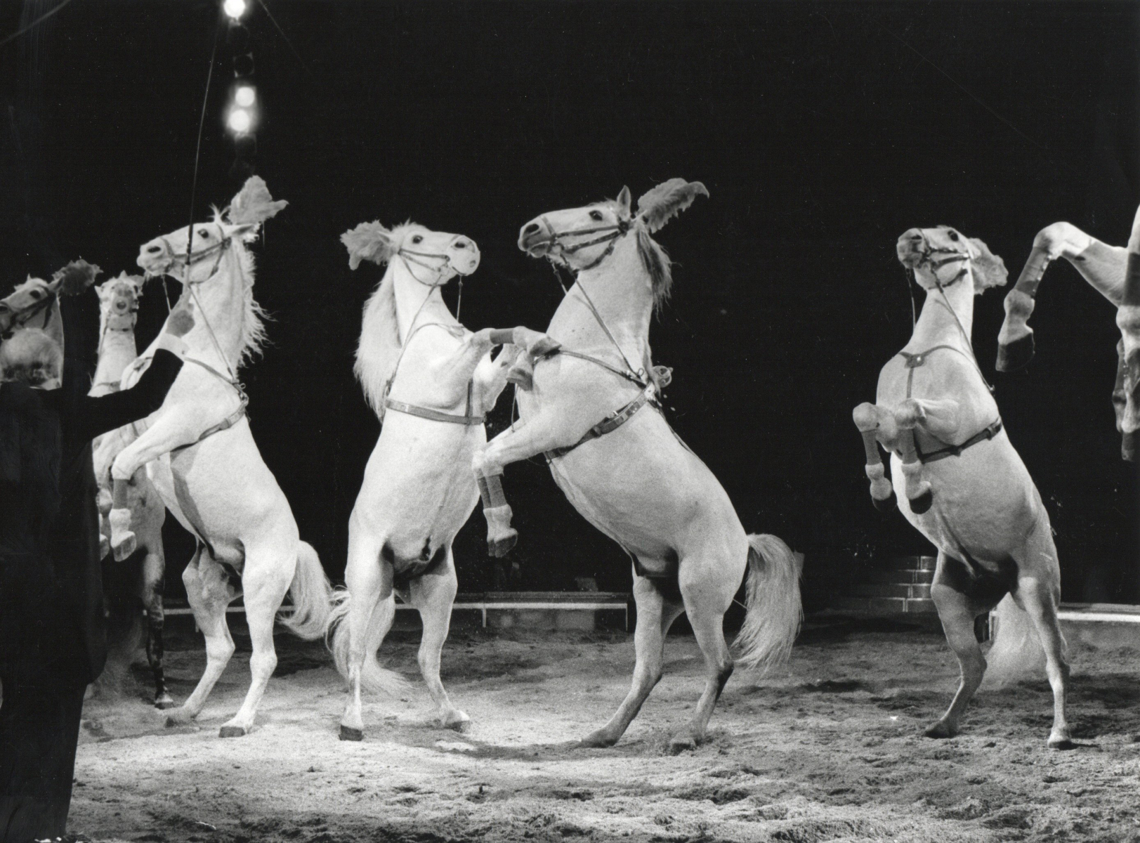 12er Zug Lipizzaner, rotes Geschirr mit Krönchen auf dem Rücken; Wiederaufnahme 1983;