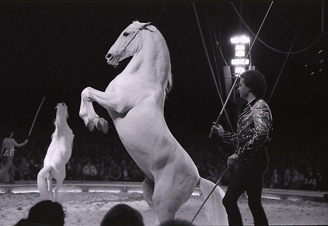 4 Lipizzaner auf Podesten; «Bodur» umkreist diese