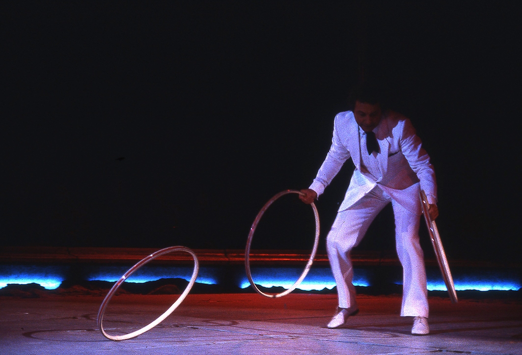 Bob Bramson arbeitet mit Holzfelgen mit den Durchmessern 18/21/26/28 inches, die er kaum je auswechseln muss. Ausnahme sind die 7 Reifen für die eigentliche Jonglage: diese werden mit der Zeit durch Reparaturen um 220 g schwerer und müssen ersetzt werden. Die Gelenke danken es, jedoch ist der Wechsel auf leichtere Requisiten mit hartem zusätzlichen Training verbunden. Das Podium auf Wiesengrund ein Thema für sich beim Rollen der Reifen.(Quelle: Zeitschrift «Manege» 1994/4)
