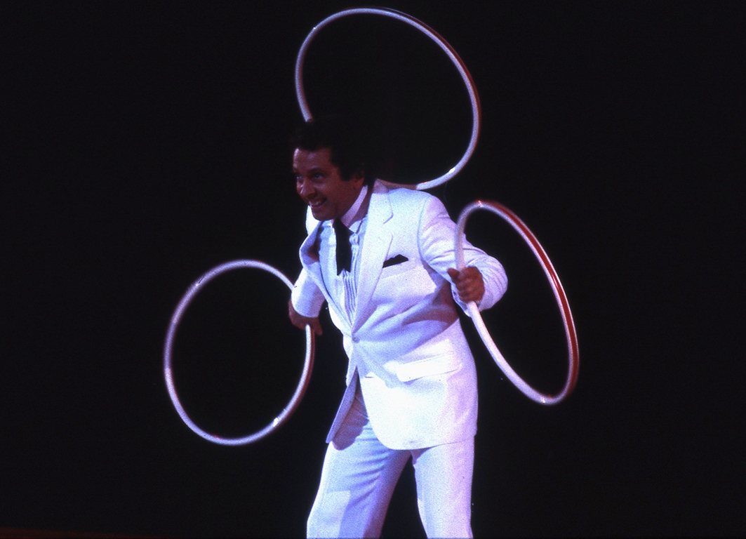 Bob Bramson arbeitet mit Holzfelgen mit den Durchmessern 18/21/26/28 inches, die er kaum je auswechseln muss. Ausnahme sind die 7 Reifen für die eigentliche Jonglage: diese werden mit der Zeit durch Reparaturen um 220 g schwerer und müssen ersetzt werden. Die Gelenke danken es, jedoch ist der Wechsel auf leichtere Requisiten mit hartem zusätzlichen Training verbunden. Das Podium auf Wiesengrund ein Thema für sich beim Rollen der Reifen.(Quelle: Zeitschrift «Manege» 1994/4)