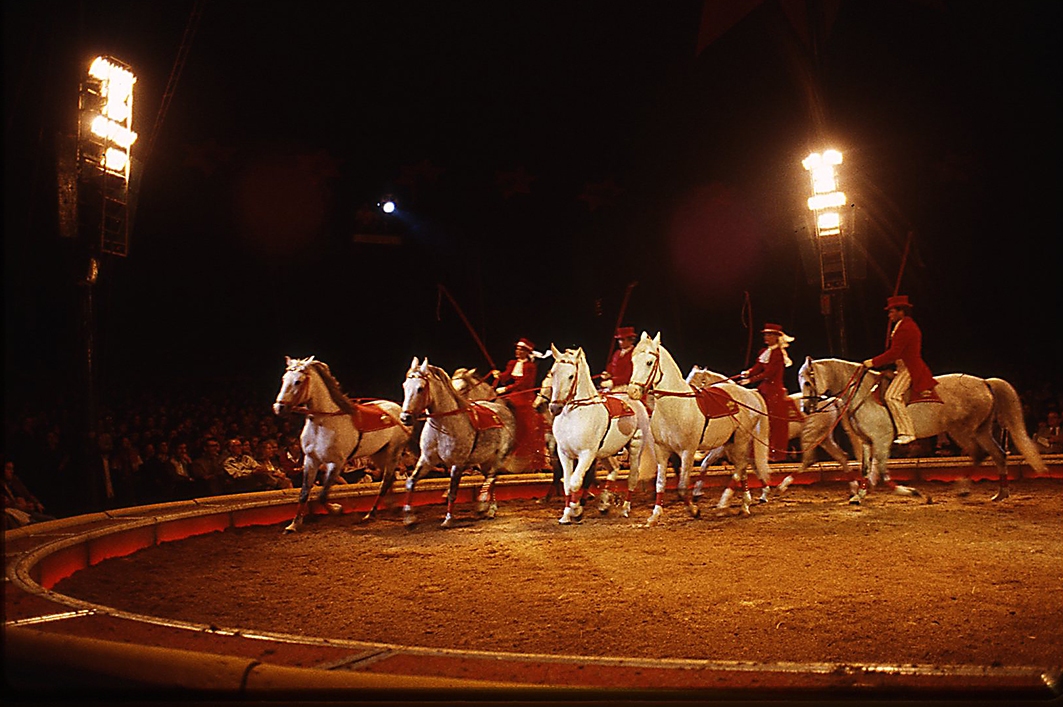 Mary-José Knie mit «Bayador», Fredy Knie jun. auf «Mogador», Erica Knie mit «Che» und Rolf Knie jun. auf «Fez» (?)