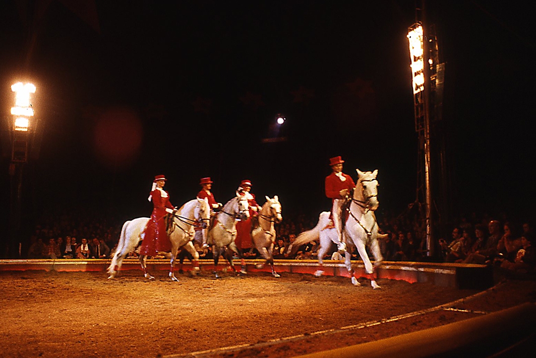 Mary-José Knie mit «Bayador», Fredy Knie jun. auf «Mogador», Erica Knie mit «Che» und Rolf Knie jun. auf «Fez» (?)