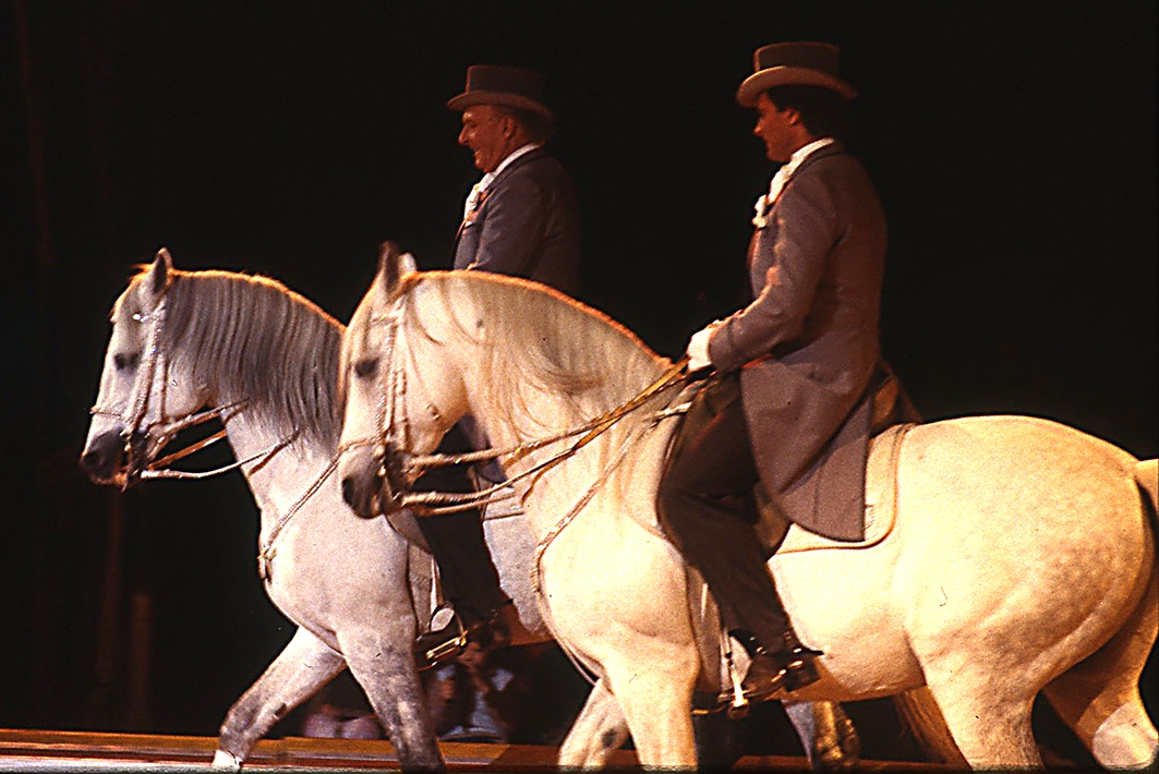 Fredy Knie sen. reitet den Lipizzanerhengst «Primo» (sein letzter Auftritt), Fredy Knie jun. auf «Mogador» und Géraldine-Katharina reitet im Damensattel auf «Pedro»