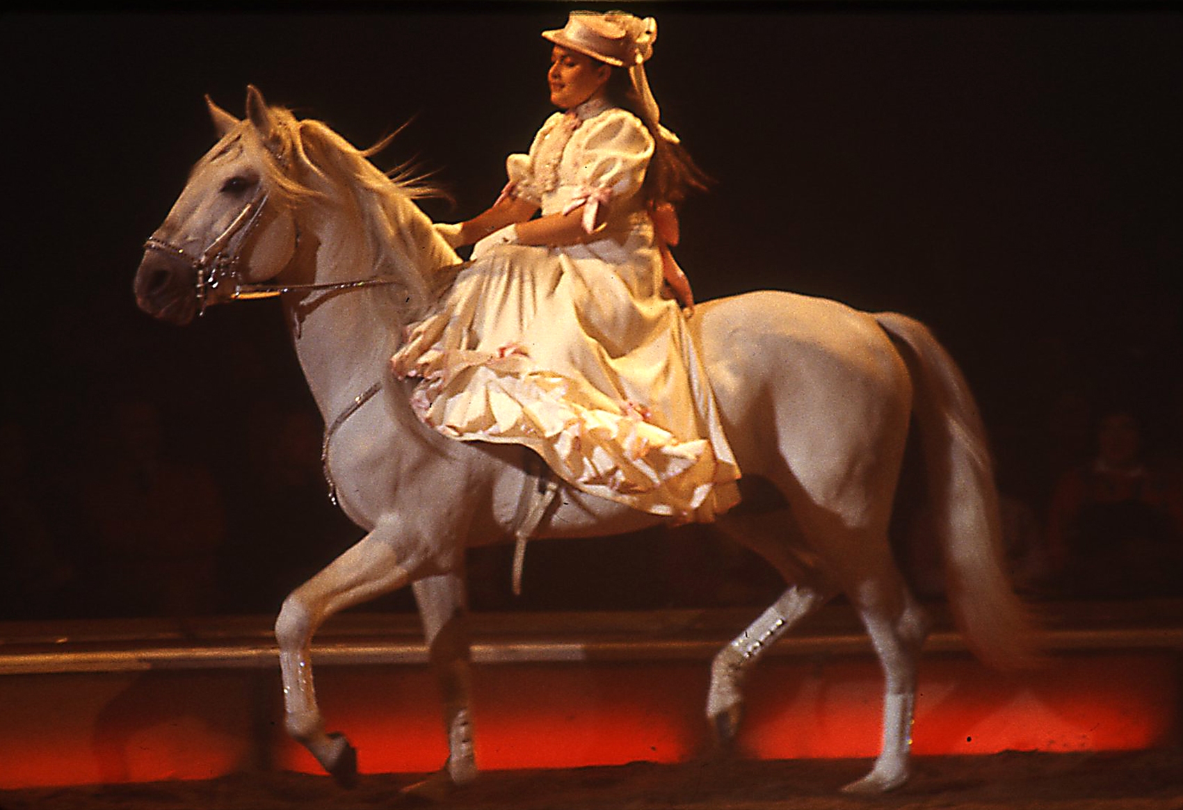 Fredy Knie sen. reitet den Lipizzanerhengst «Primo» (sein letzter Auftritt), Fredy Knie jun. auf «Mogador» und Géraldine-Katharina reitet im Damensattel auf «Pedro»