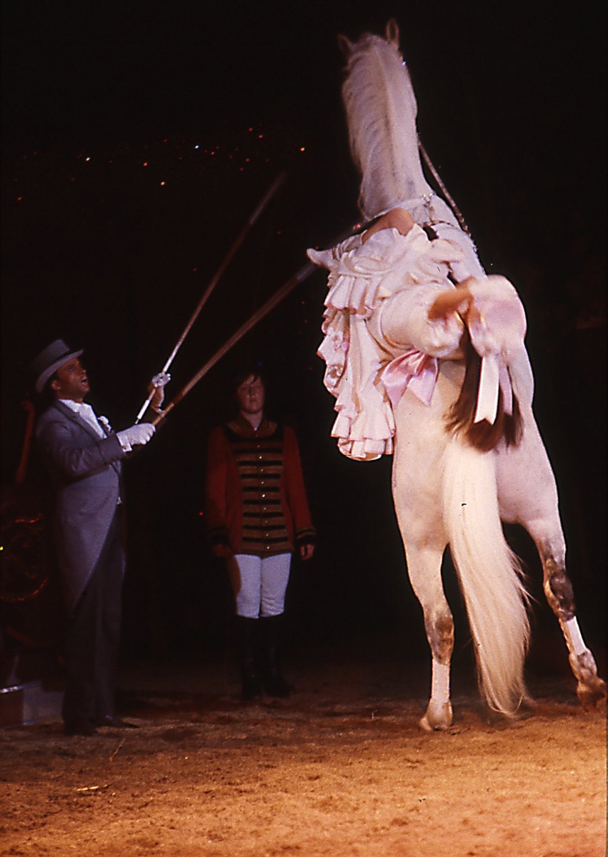 Fredy Knie sen. reitet den Lipizzanerhengst «Primo» (sein letzter Auftritt), Fredy Knie jun. auf «Mogador» und Géraldine-Katharina reitet im Damensattel auf «Pedro»