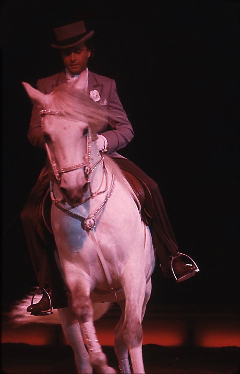 Fredy Knie sen. reitet den Lipizzanerhengst «Primo» (sein letzter Auftritt), Fredy Knie jun. auf «Mogador» und Géraldine-Katharina reitet im Damensattel auf «Pedro»