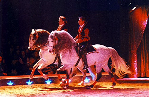 Fredy Knie jun. auf «Escultor», Mary-José Knie auf «Beduino»; Sacha Houcke jun. auf «Vaquero», Géraldine-Katharina als Debüt auf «Bolero»