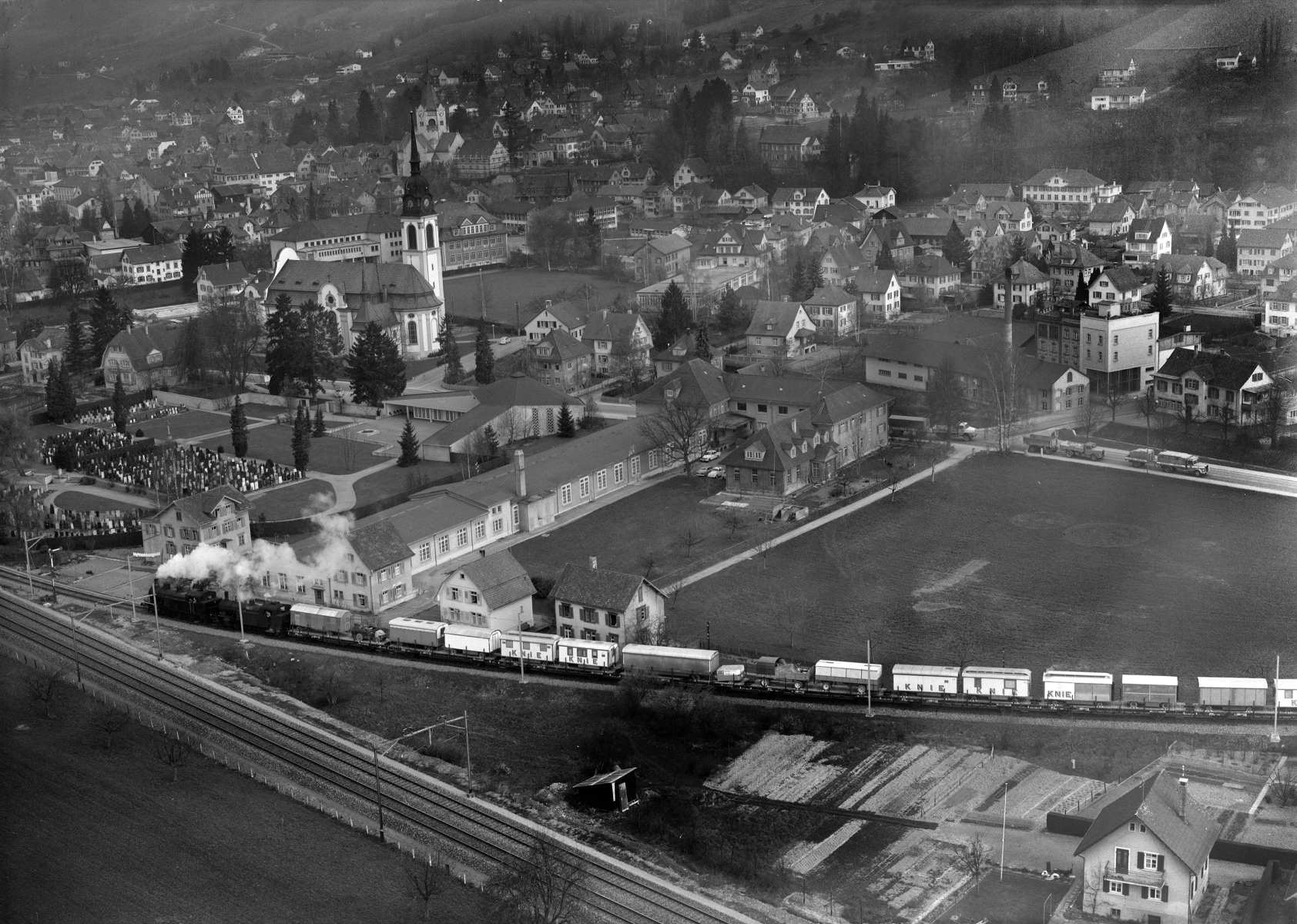 1965 Am 7. April wird der KNIE-Zug letztmals von einer Dampflokomotive gezogen. Die Fahrt führt von Kreuzlingen TG über Weinfelden nach Frauenfeld TG. Ziehende Lok war eine Eb 3/5 5820 und die schiebende eine Ec3/5-2.