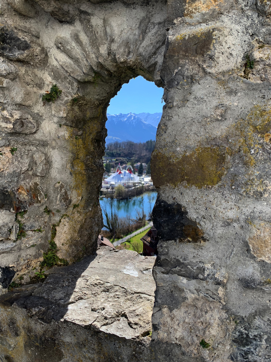 Blick vom Schloss Werdenberg auf den Circus KNIE in Buchs SG am 22. März 2023.