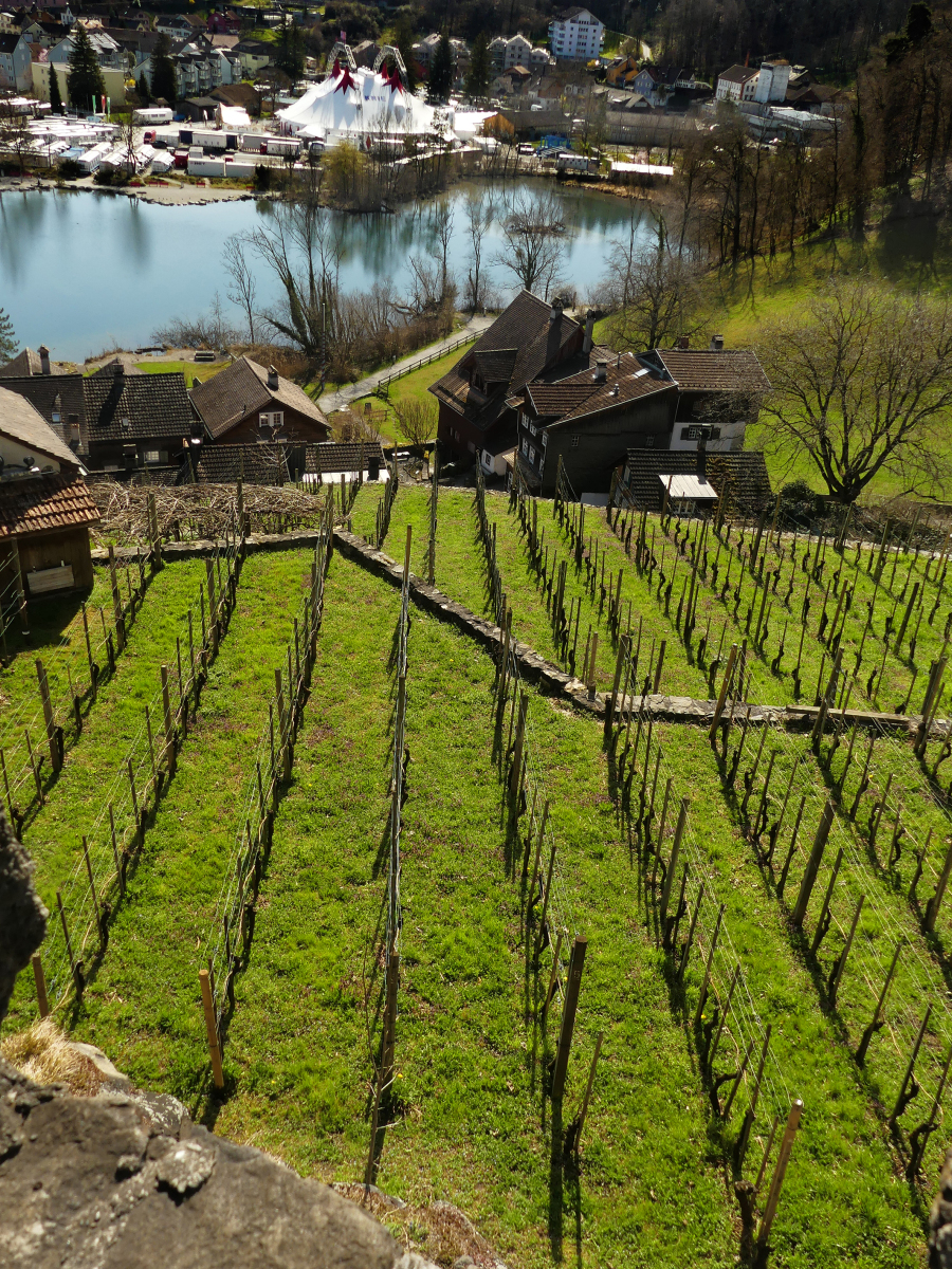 Blick vom Schloss Werdenberg über den Rebhang und Werdenbergersee zum Circus.