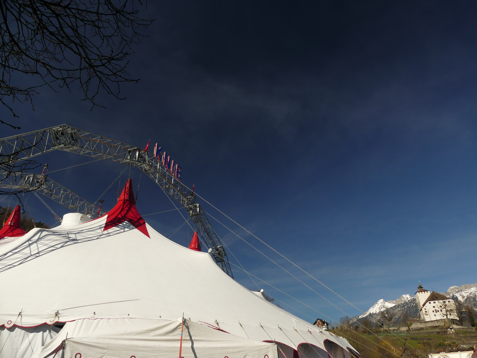Der Circus steht direkt am Werdenbergersee mit Blick aufs Schloss Werdenberg. (Panoramabild: Urs Zuppinger)