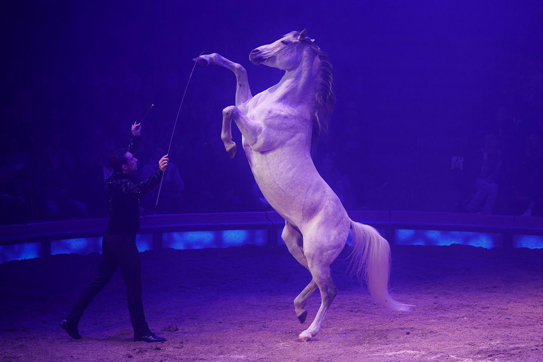 Ivan-Frédéric Knie präsentiert ein einzigartiges Pferdekarussell mit 30 Hengsten (holländische Friesen, Vollblut-Araber und Andalusier P.R.E.).