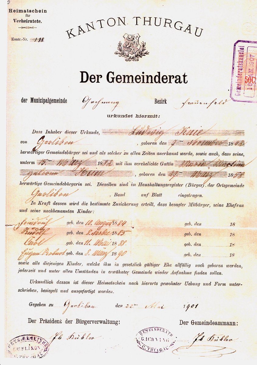 3. Generation: Heimatschein der Gemeinde Gerlikon bei Frauenfeld TG; Seite 1