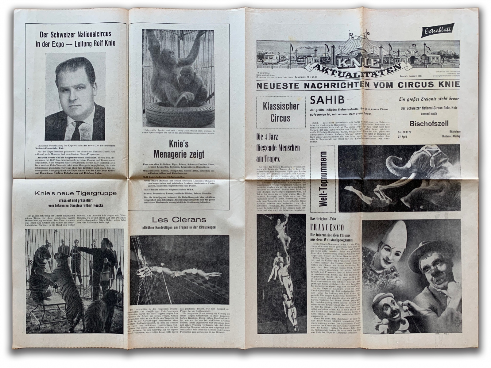Caroli, Donald Brun, Flugblatt, Flyer, Galerie, KNIE-Illustrierte, Marcus Campbell, Plakate, Trio Francesco, Zooführer