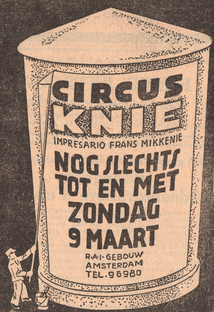 Fredy Knie reist am 10. Dezember 1938 mit 60 Pferden und Ponys, 8 Kamelen, Zebras und 5 Elefanten nach Amsterdam. Er wird von seinem Vater Friedrich, Bruder Rolf und Onkel Charles begleitet. Die Knie-Nummern bilden den Hauptteil des Programms und heimsen einen Riesenerfolg ein: das Gastspiel wird um einen Monat verlängert und danach noch in Den Haag gezeigt.