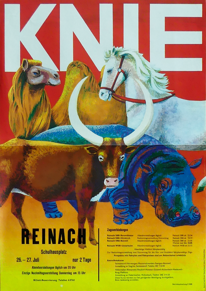 Bahnplakate, Flugblatt, Flyer, Galerie, Georges Dessibourg, Herbert Leupin, KNIE-Illustrierte, Marcus Campbell, Plakate, Rivels, Teddy Brunner
