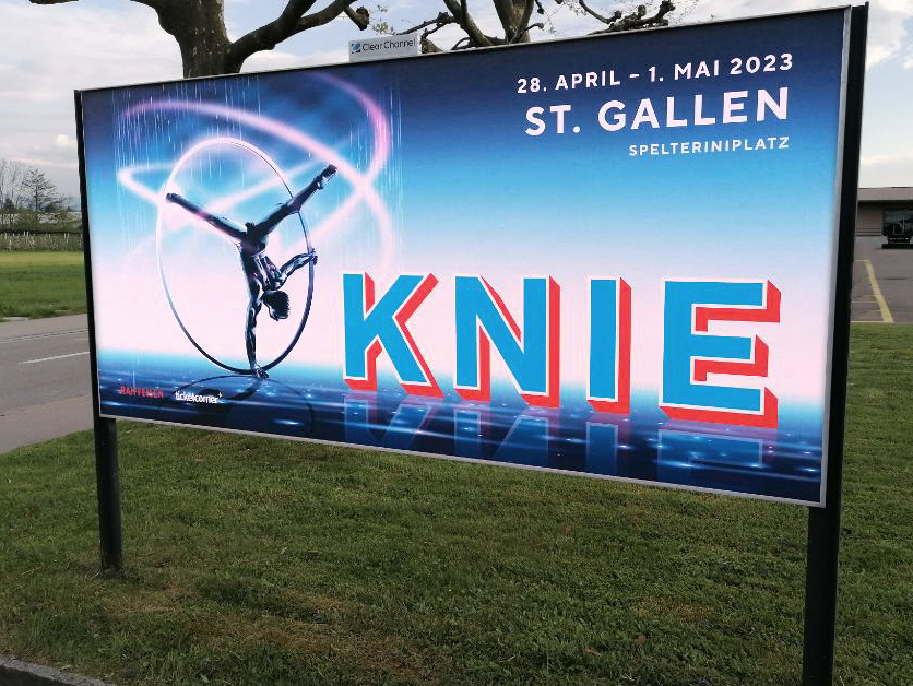 Plakat F4 von Mirko Noser, seine vierte Kreation für KNIE nach 2008, 2014 und 2015; Sujet: Jeka Dethairov, Cyr Wheel