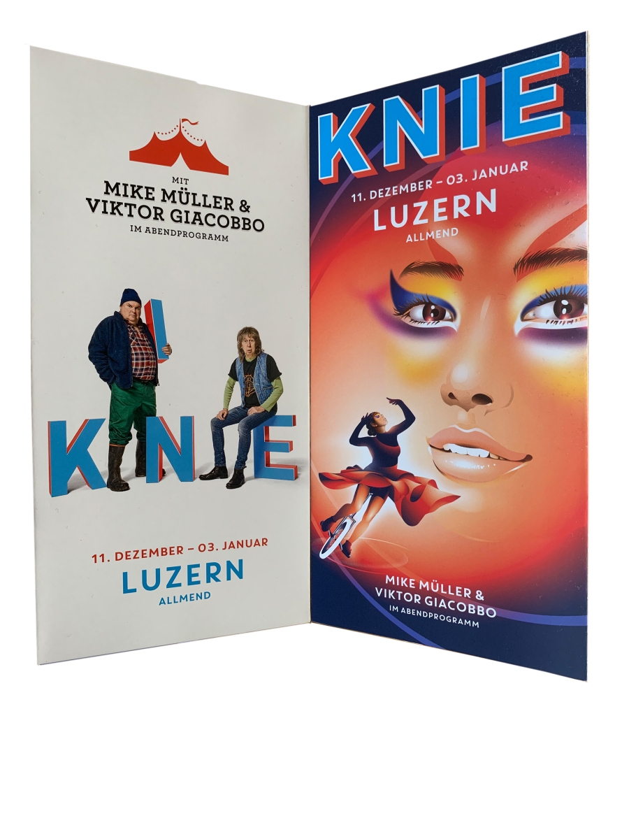 Flyer, KNIE-Illustrierte, KNIE-Magazin, Kreuzlingen, Marie-Thérèse Porchet, Mike Müller, Mirko Noser, Plakate, St.Gallen, Viktor Giacobbo, Winterthur, Zürich