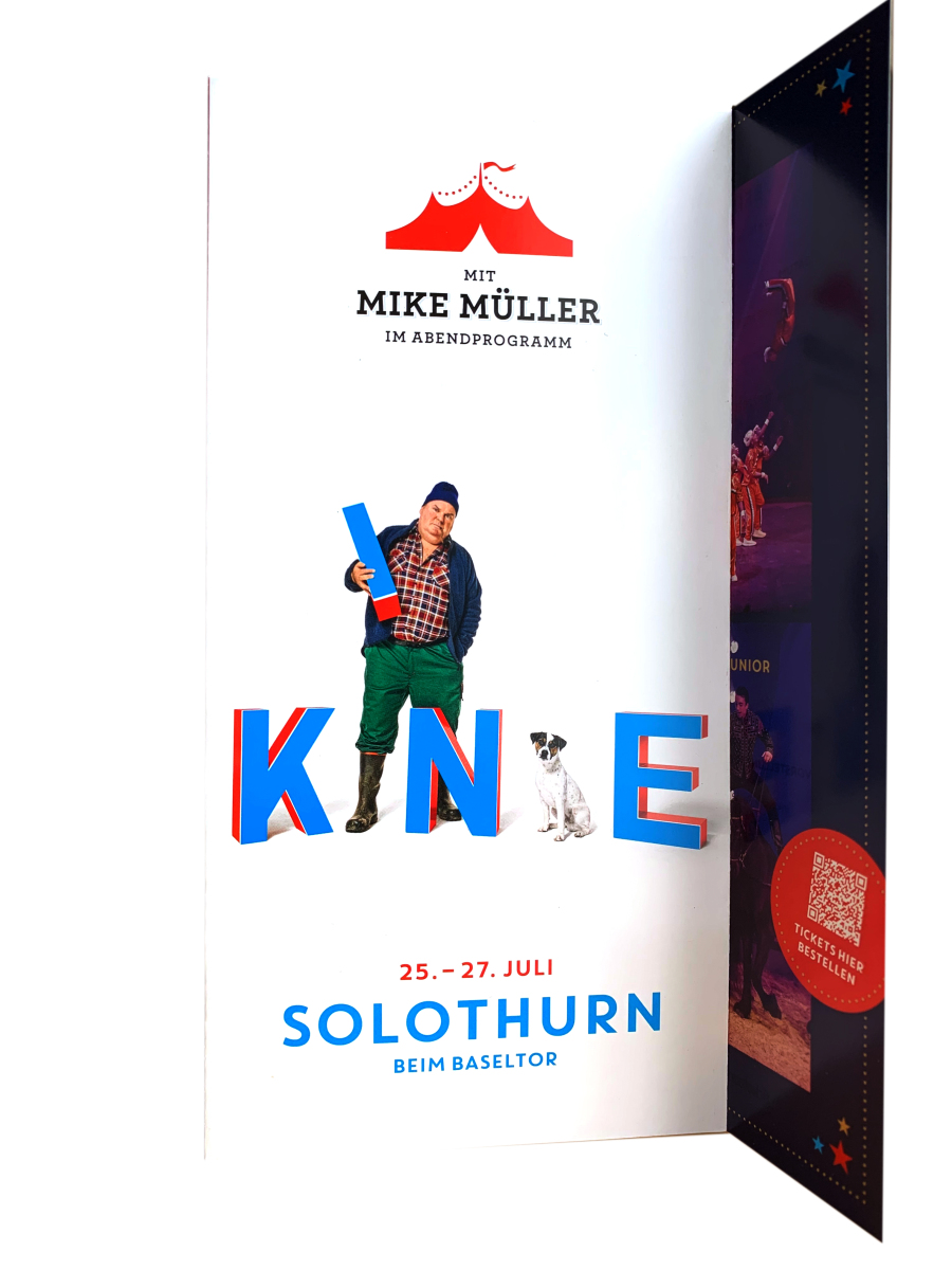 Flyer, KNIE-Illustrierte, KNIE-Magazin, Kreuzlingen, Marie-Thérèse Porchet, Mike Müller, Mirko Noser, Plakate, St.Gallen, Viktor Giacobbo, Winterthur, Zürich