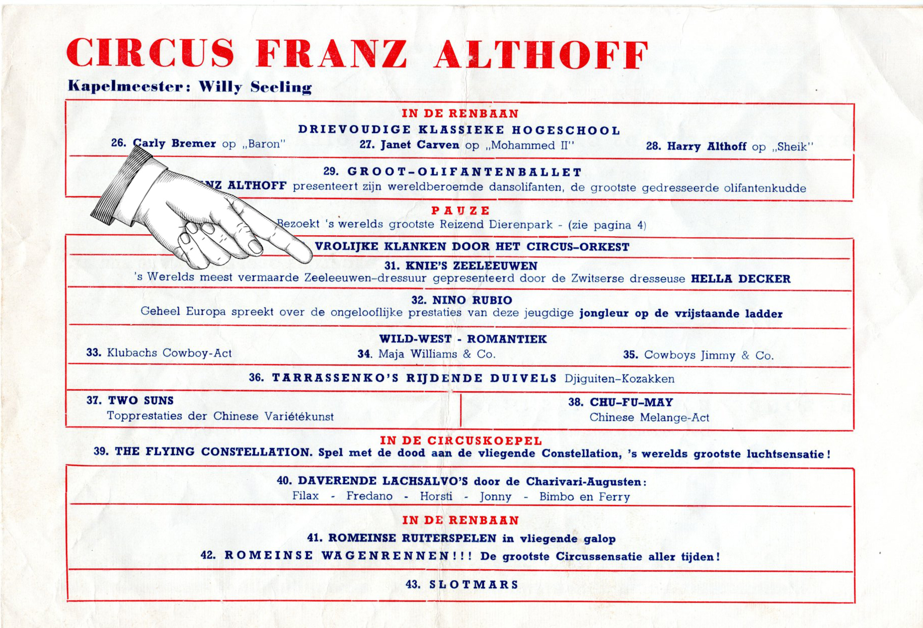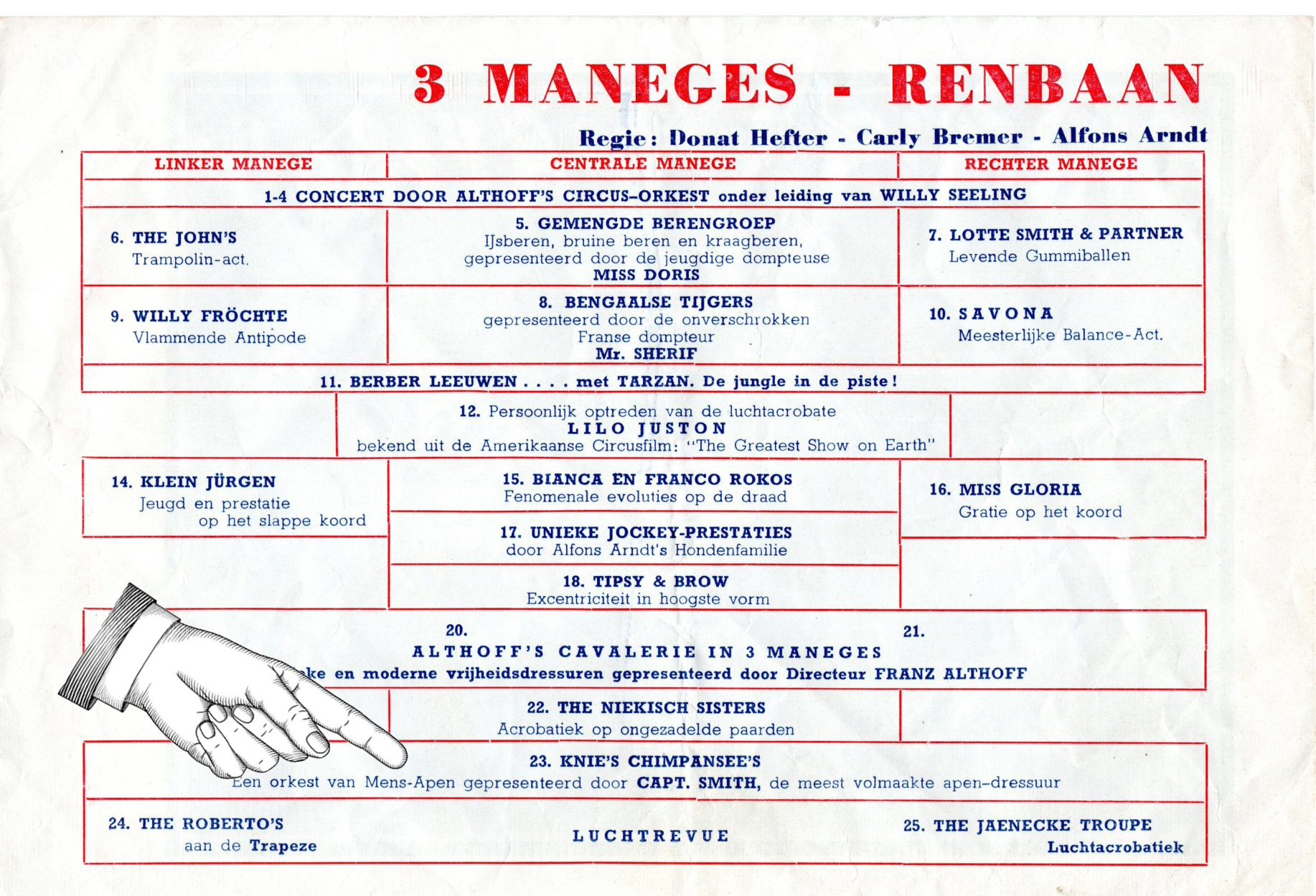 18. Dezember 1953 – 7. Januar 1954: Rolf Knie sen. mit einem Elefantenballett (siehe Foto), Enrico Zimmermann mit einem 12er Zug Ponys, einem Exoten-Tableau, Tigerschecken und Brauerei-Pferden. Alfred Dudy Leon Smith mit KNIE’s Schimpansen. Ebenfalls im Programm: Harri Belli mit einer Hohen Schule und einer siebenköpfigen Löwengruppe sowie Pipo Sosman sen. & Dario: