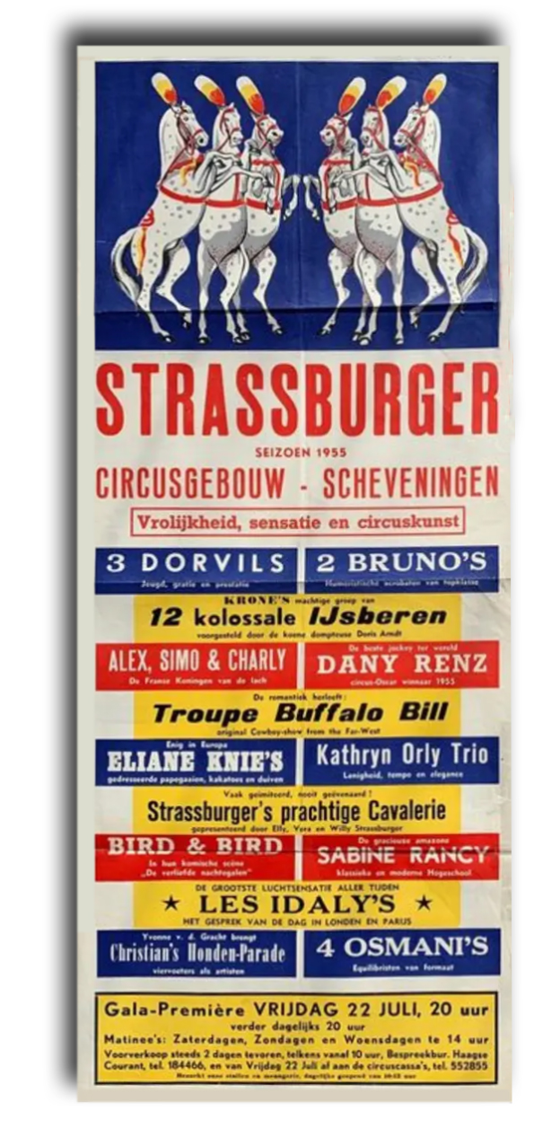 Eliane KNIE ist mit ihren Papageien, Tauben und Kakadus im STRASSBURGER-Bau (Direktion Regina & Elly Strassburger) im holländischen Scheveningen engagiert. Première ist erst am 22. Juli 1955!