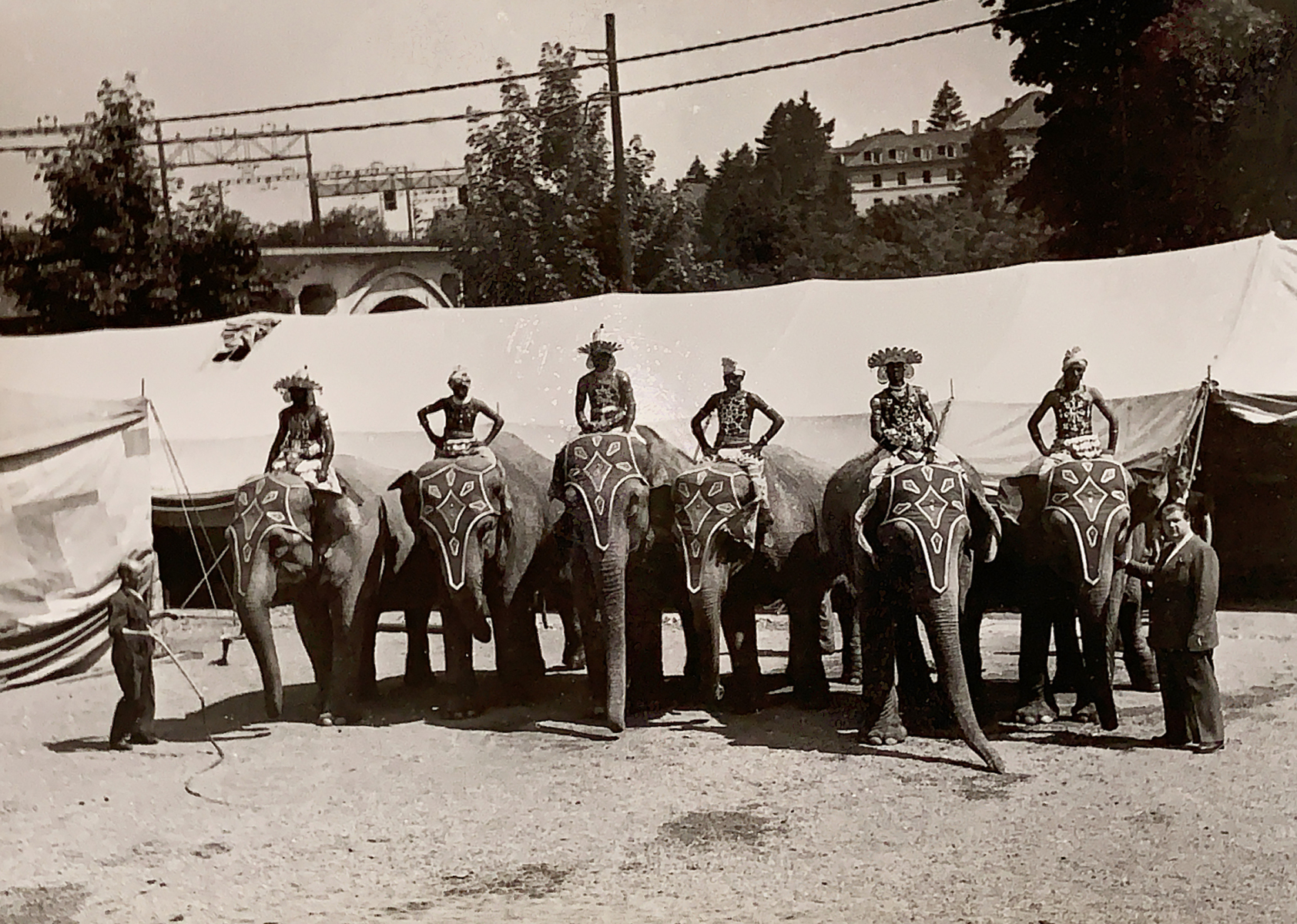 Weltpremière in der Circusgeschichte: Rolf Knie sen. präsentiert afrikanische Elefanten in der Manège. Bulle «Siam» kommt in die Elefantenherde.