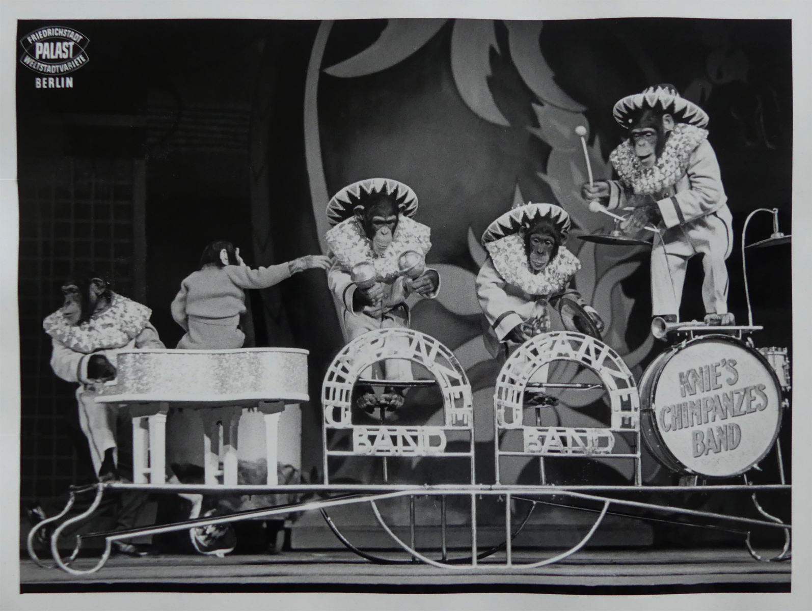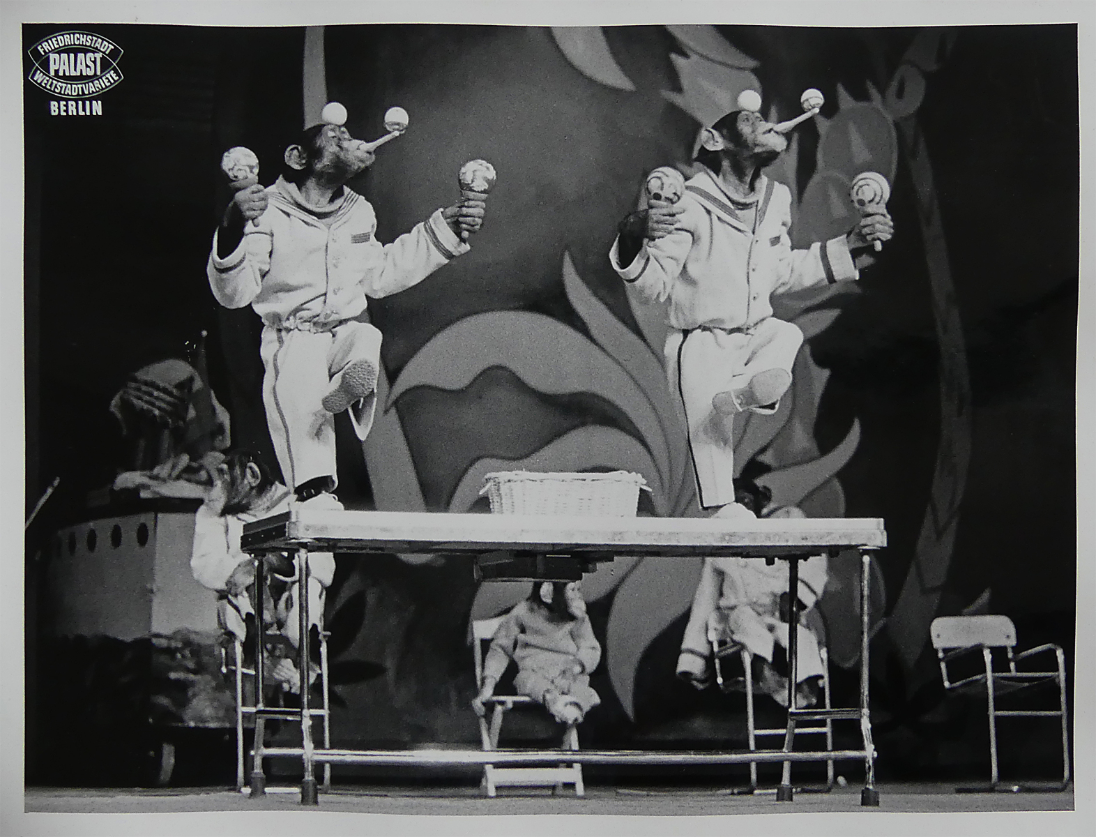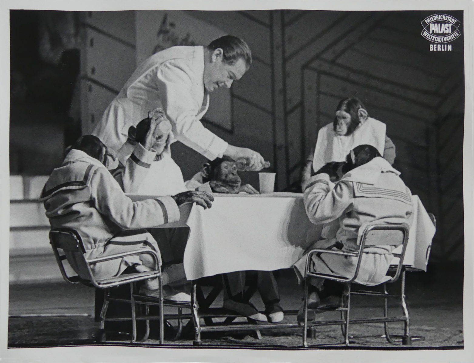 Wintergastspiel vor Saisonbeginn: Im Februar 1957 tritt Alfred Dudy Leon Smith mit KNIE’s Filmschimpansen in der «Palast-Revue 1957» des Friedrichstadtpalastes Berlin auf: