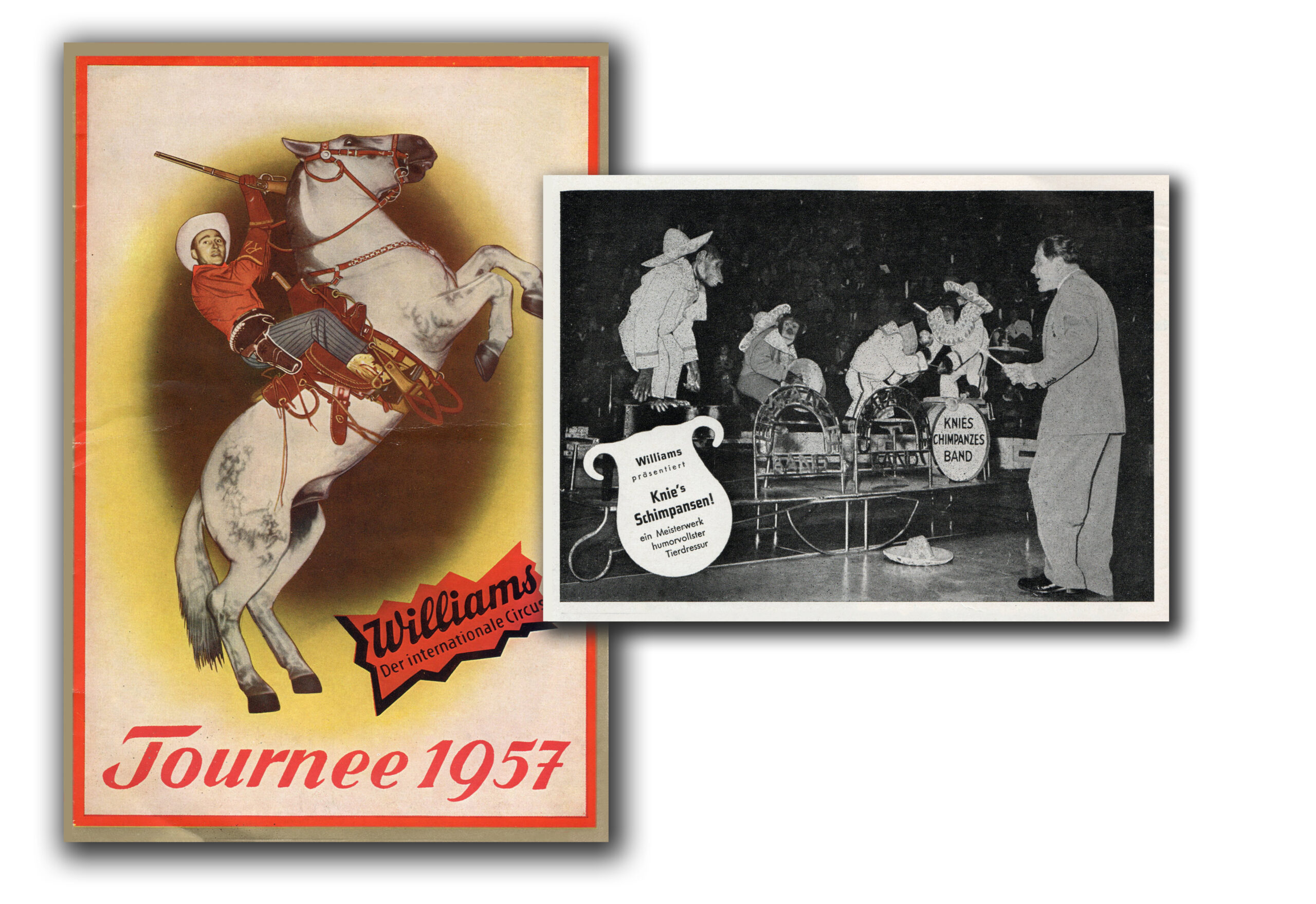Alfred Dudy Leon Smith zeigt 1957 KNIE’s Schimpansengruppe beim Circus WILLIAMS (Carola Williams-Althoff) in Deutschland.