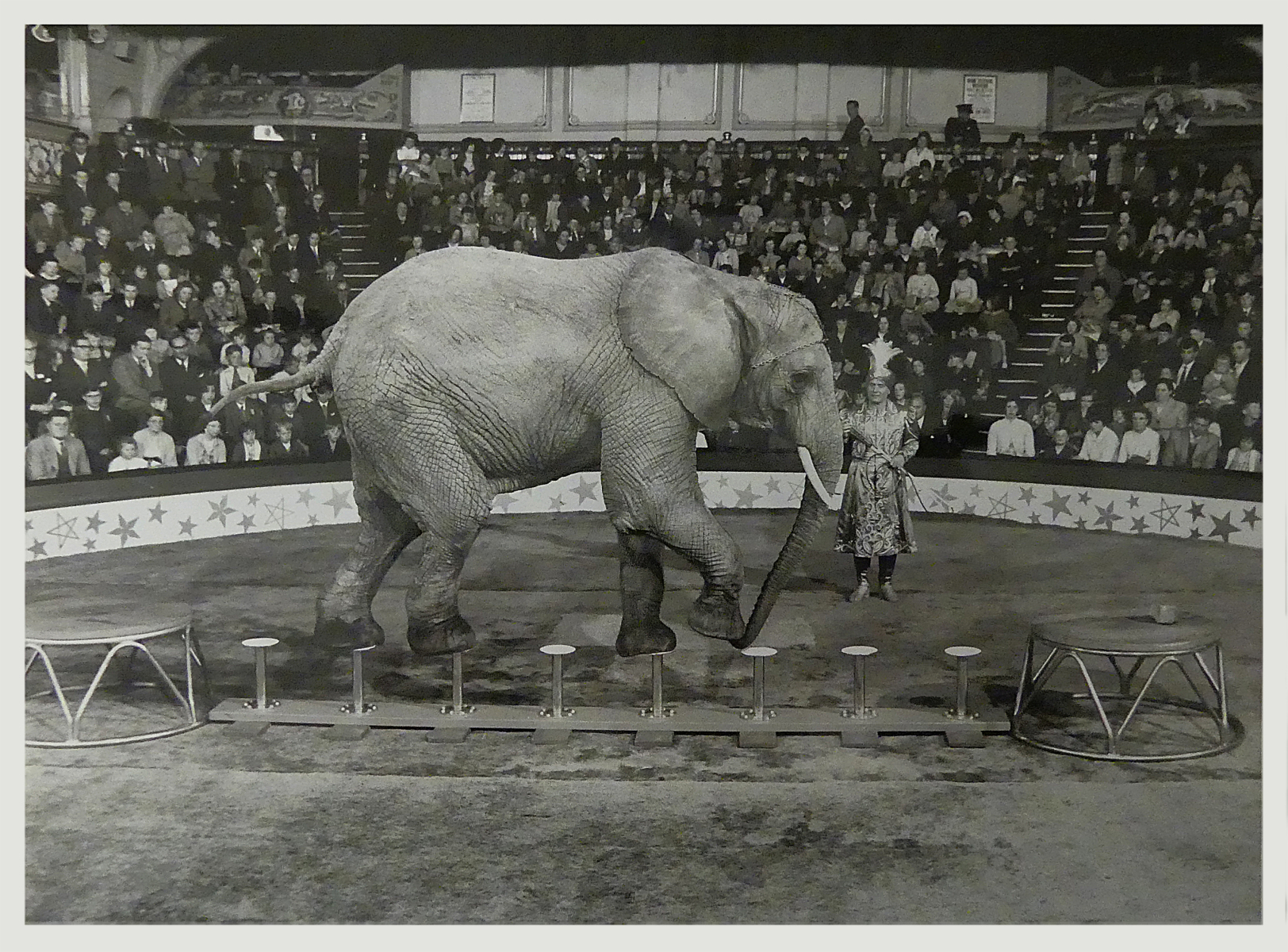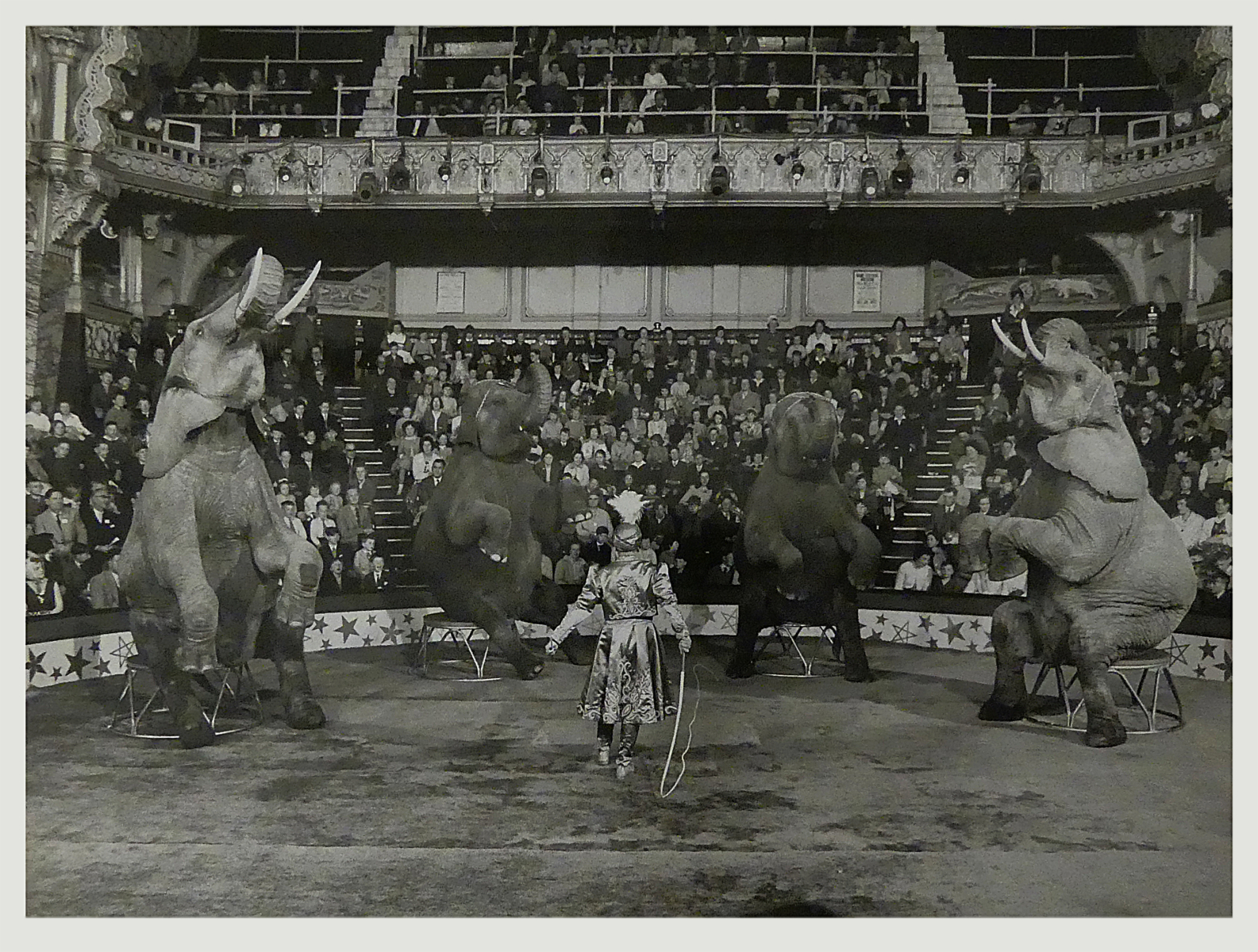 Josef Hack und Franz-Richard Altoff beim BLACKPOOL TOWER CIRCUS in Grossbritannien: afrikanische und indische Elefanten, Knie’s Puppenpferde (polnische Araber), norwegische Fjordenpferde und Zebras; Palominohengst «Rebell» (Apportierpferd) und im Tierkarussell fehlen noch die ……. Ponys!