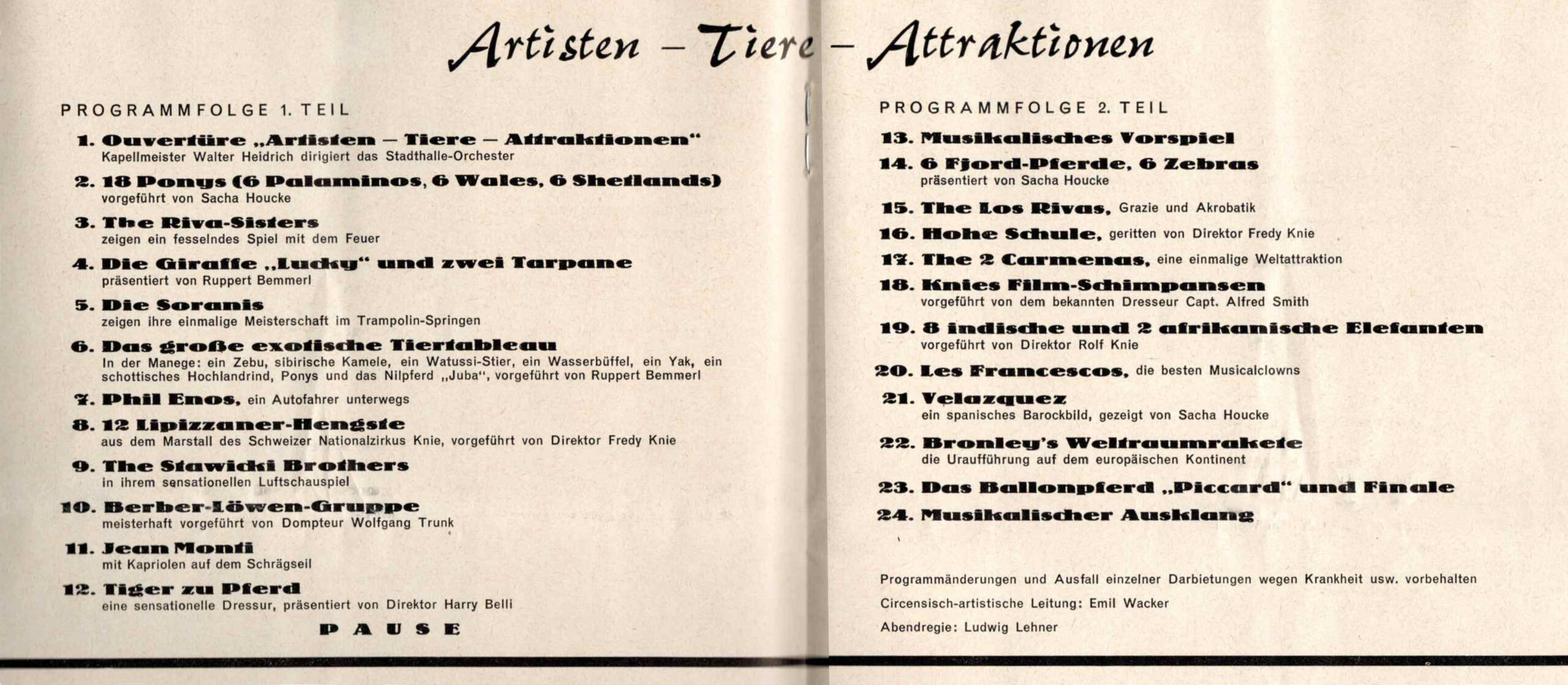 Programmfolge ATA 1962 mit Fredy KNIE sen., Rupert Bemmerl, Sacha Houcke und Alfred Dudy Leon Smith sowie den Carolis