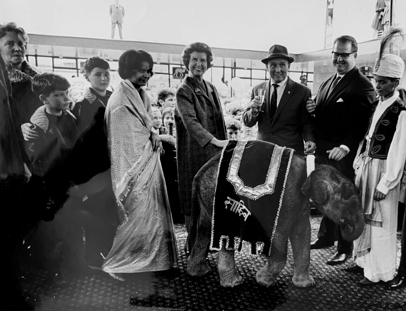 Elefantentaufe am 24. April 1963 in Zürich; vl Frau Adda Hack, Franco Knie, Louis Knie, X, Frau Ringier, Josef Hack, Herr Rolf