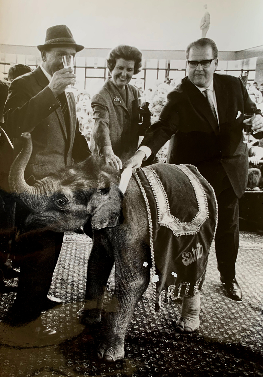 Elefantentaufe am 24. April 1963 in Zürich; Vl Josef Hack, Frau Ringier, Herr Rolf