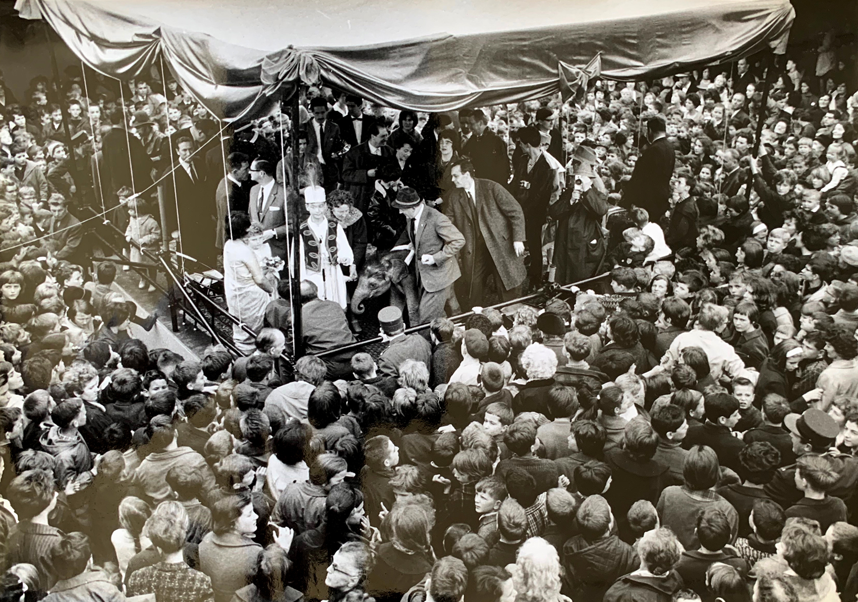 Elefantentaufe am 24. April 1963 in Zürich; bei Sahib-Fridolin steht Herr Josef Hack, hinter ihm der damalige Pressechef Jörn Kübler